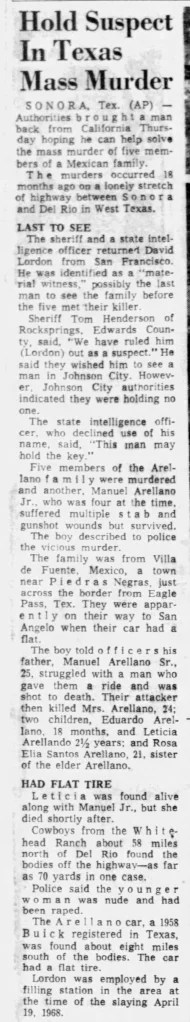 Leticia was found alive along with Manuel Jr., but she died shortly after. Cowboys from the White,-head Ranch about 58 miles north of Del Rio found the bodies off the highway as far as 70 yards in one case. ‘ Police said the younger, woman was nude and had been raped. The Arellano car, a 1958 Buick registered in Texas, was found about eight miles south of the bodies. The car had a flat tire. Lordon was employed by a filling station in the area at the time of the slaying April 19, 1968.
